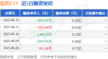 本站消息,6月12日,医药ETF(512010)融资买入1.67亿元金御优配,融资偿还1.86亿元,融资净卖出1873.01万元,融资余额9.22亿元。